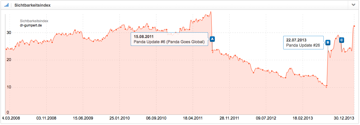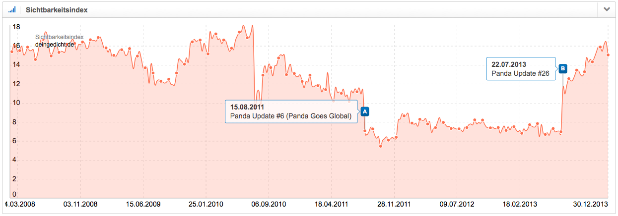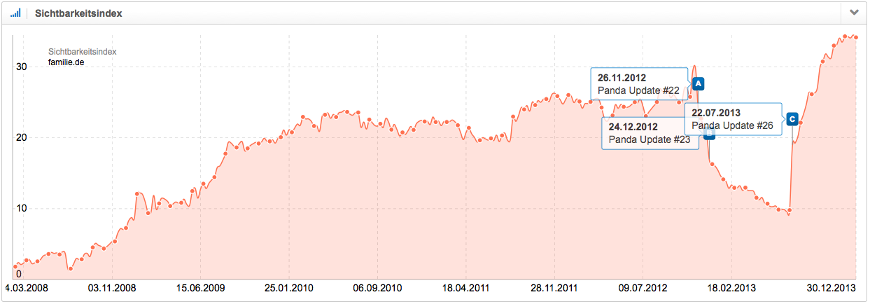 Im vergangenen Juli hat Google neue Signale gefunden, um das Panda-Update feiner auszusteuern. Mit dem Panda Update #26 wurden eine ganze Reihe Domains „begnadigt“ und aus den Krallen des Pandas entlassen. Einige Domains konnten diese neu erweckte Zuwendung seitens Google bis zum Jahresende weiter ausbauen und schafften es somit in die Liste der Gewinner 2013. Dazu zählen beispielsweise deingedicht.de, familie.de und dr-gumpert.de.