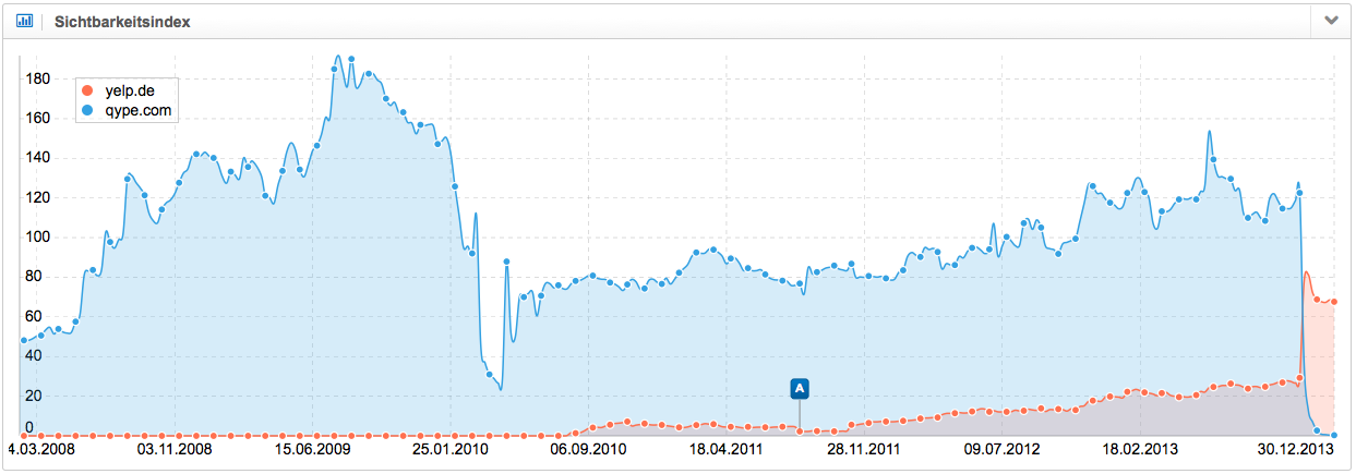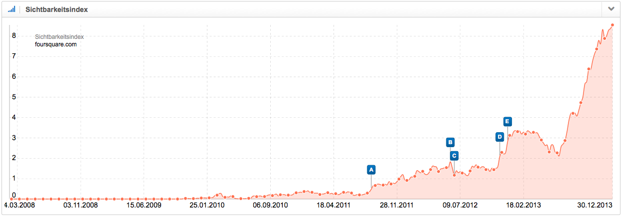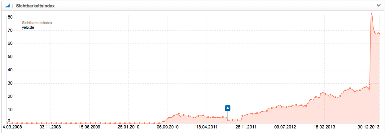 Viel Bewegung gab wieder einmal im Bereich der lokalen Suche und der Branchenbücher. Yelp.de konnte seine Sichtbarkeit durch die Übernahme von Qype deutlich steigern, in Summe verlieren die beiden Plattformen jedoch. Das Bewertungssystem von foursquare.com ist nach Ansicht vieler Nutzer am wenigsten anfällig für Bewertungsspam. Außerhalb der Großstädte ist die Datenbasis aber noch dünn. Unter dem Strich setzt Foursqare aber seinen Erfolgskurs fort und steigert seine Sichtbarkeit um 173 Prozent. Die Kollegen von stadtbranchenbuch.com wurden Ende 2012 hart vom Panda-Update #22 getroffen. Die typische Anti-Panda-Taktik mit einer kleinteiligen Stückelung und Verlegung der Inhalte auf Sub-Domains hat seit Februar bis Ende 2013 den gewünschten Erfolg gebracht.