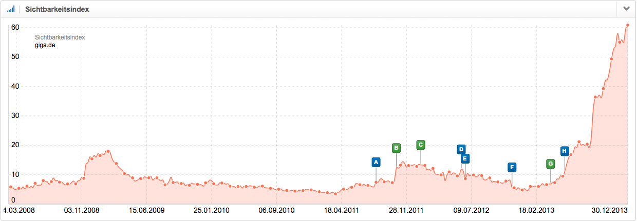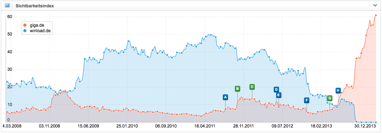 Die Domain giga.de konnte ihre Sichtbarkeit nicht um den passenden „Einheitenfaktor Milliarde“ steigern, aber führt nach prozentualen Gewinnen die Liste der Gewinner deutlich an. Abgesehen davon, dass dort aus SEO-Sicht vieles richtig gemacht wird, dürfte insbesondere die Integration von winload.de für den Anstieg verantwortlich sein. Wir haben die Fallstudie ausführlich im Oktober in diesem Artikel beschrieben.