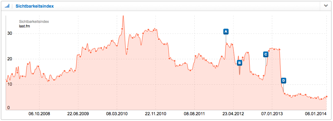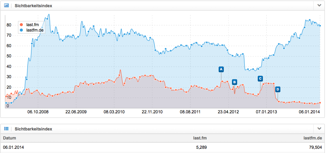 Auf Platz 1 der Verlierer-Liste findet man nach prozentualen Verlusten last.fm (Grafik). Diese Verluste sind sicherlich vom Betreiber gewollt, da deutschsprachige Nutzer auf lastfm.de (Grafik) weitergeleitet werden. Insofern hätte man die Domain auch aus der Liste streichen können. Da das Thema Geotargeting jedoch wichtig ist, halte ich auch das Beispiel für wichtig. Bei last.fm werden Land und Sprache über das hreflang -Attribut ausgesteuert, was 2013 offenbar mit wachsendem Erfolg gelungen ist.