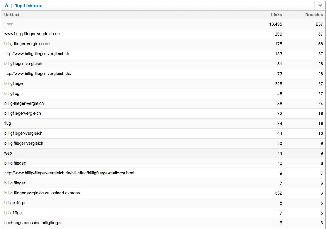 Wir haben 2013 ein kurzes Video veröffentlicht, woran man erkennen kann, ob eine Domain vom Penguin-Update betroffen ist. Ein typisches Beispiel für Link-Spam mit zu vielen unnatürlichen Money-Keyword-Links zeigt ein Blick auf die am häufigsten verwendeten Linktexte von billig-flieger-vergleich.de (Grafik) auf Platz 22 unserer Liste.