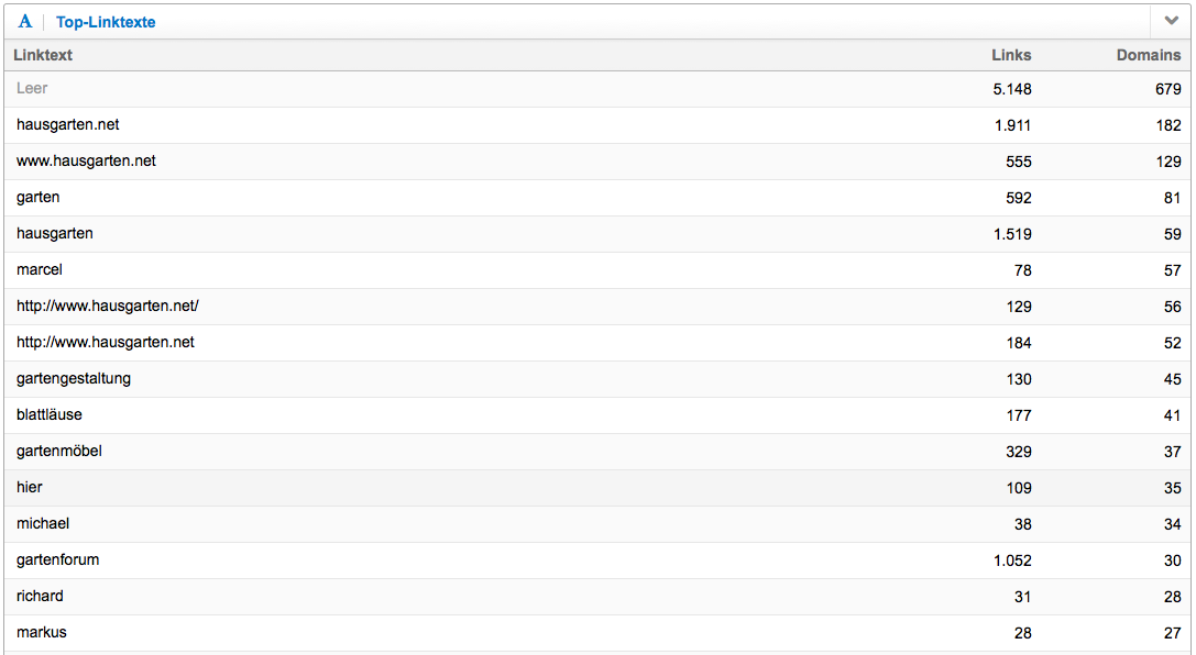 In der Liste der Absteiger findet man auch Domains, die möglicherweise sowohl vom Panda als auch vom Penguin betroffen sind, wie z.B. hausgarten.net (Grafik) auf Platz 3. Während die Verluste durch das Panda-Update sehr deutlich sind, sind die Penguin-Verluste nicht ganz so eindeutig. Aber auch hier zeigt ein Blick auf die Linktexte eine beachtenswert hohe Wahrscheinlichkeit für einen Zusammenhang.