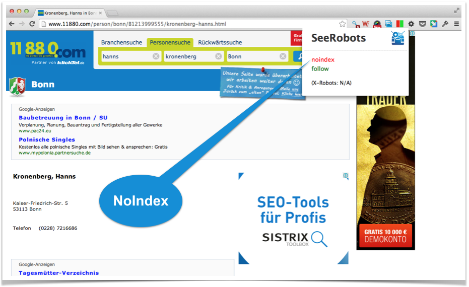 Neben den allgemeinen Trend gibt es in der Verlierer Liste natürlich auch einige individuelle Fälle. So wurden bei 11880.com (Grafik) auf Platz 8 der Liste beispielsweise die Inhalte des erfolgreichsten Verzeichnisses /personen/ (Grafik) im November 2013 offenbar auf NoIndex gesetzt. Über die Gründe kann man nur mutmaßen.