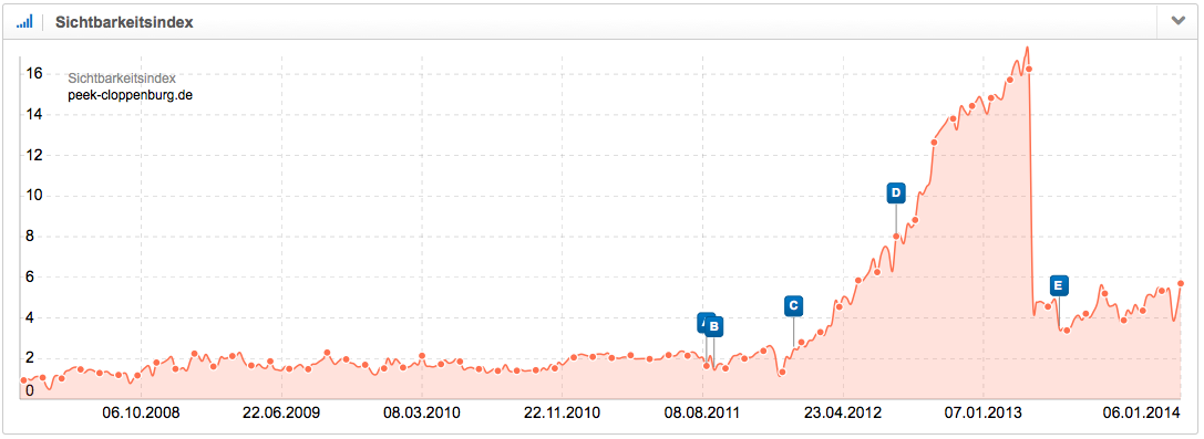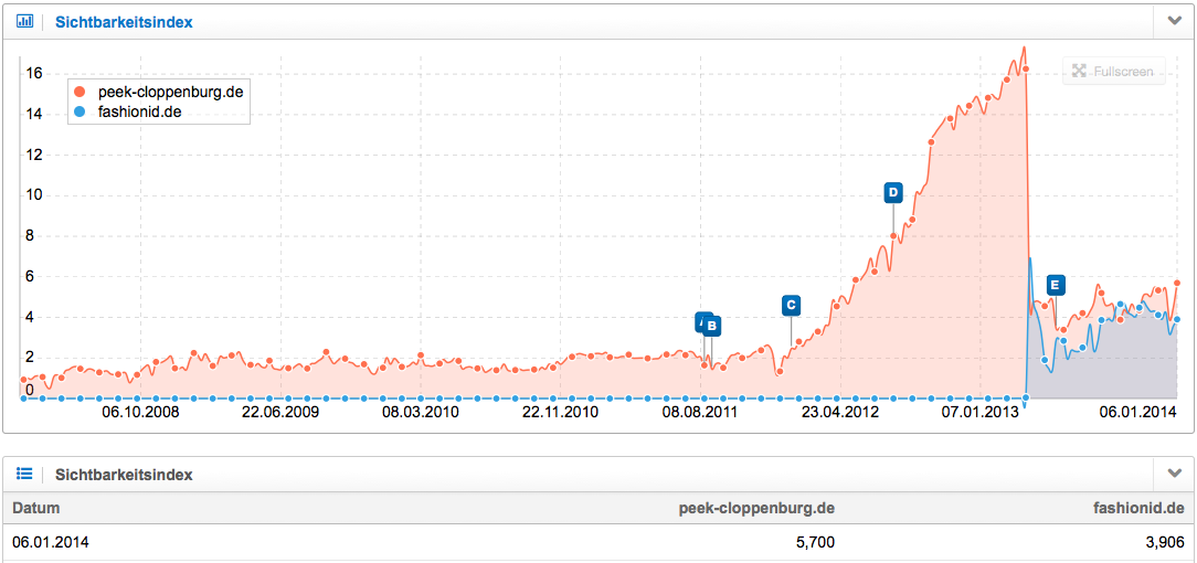 Die Domain peek-cloppenburg.de (Grafik) hätte eigentlich wie viele andere Marken-Websites auf der Gewinner-Liste stehen können. Ein jähes Ende fand der 2012 sehr schön beginnende Aufwärtstrend jedoch im Frühjahr 2013 nach einem Relaunch, so dass die Domain sich jetzt auf der Verlierer-Liste befindet (Platz 16). Beim erstmaligen Besuch von peek-cloppenburg.de erhalten Nutzer ein Overlay, das einen zu einem Besuch des neu geschaffenen, aber bei Google nicht etablierten, Shops auf fashionid.de „zwingt“. Es ist praktisch unmöglich über die Startseite einen Inhalt von peek-cloppenburg.de zu erreichen. In Summe bedeutet das ein dickes Minusgeschäft (Grafik) in der Sichtbarkeit. Das hätte man unter Zuhilfenahme eines SEO-Experten deutlich eleganter und erfolgreicher lösen können.