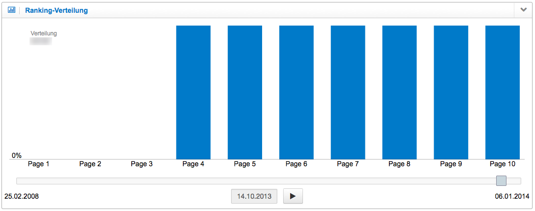 Neben den algorithmischen Panda- und Penguin-Filtern waren sicherlich bei einigen Domains auch manuelle Penalties für die Verluste verantwortlich. Diese lassen sich von außen nicht so leicht mit hoher Sicherheit erkennen. Inzwischen werden die Websitebetreiber darüber über die Google Webmaster Tools informiert, wenn sie ihre Domain dort angemeldet haben. Von außen hilft oftmals ein Blick auf die Rankingverteilung. Eine solche Verteilung wie in diesem Screenshot ohne Rankings auf den ersten drei Suchergebnisseiten ist ein Musterbeispiel für eine manuelle Penalty wegen unnatürlichem Linkaufbau.