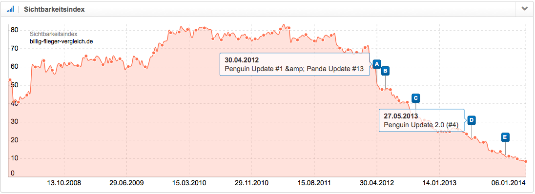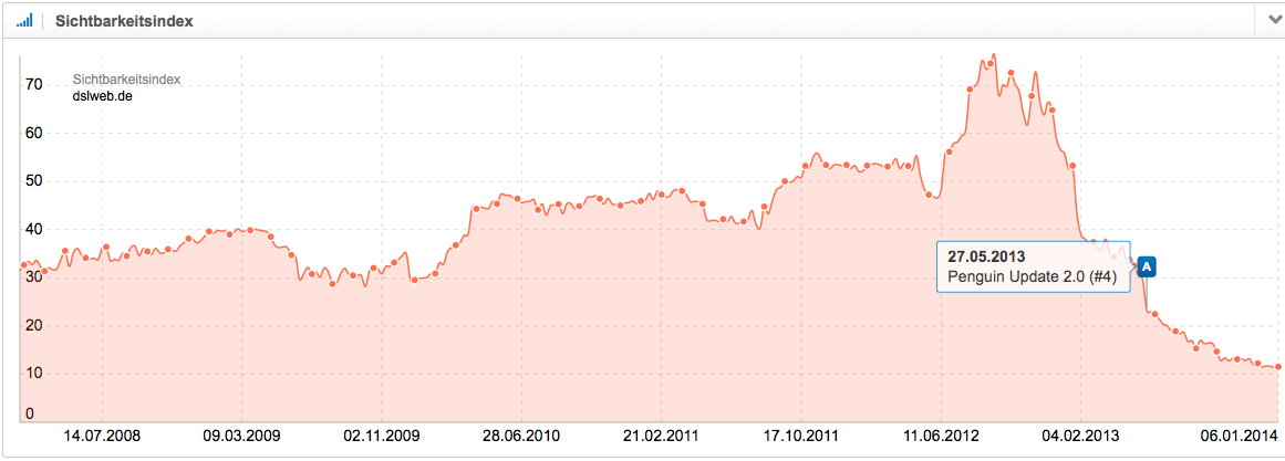 Typisches Beispiele für Verluste durch ein Penguin-Update finden wir mit dslweb.de (Grafik) auf Platz 2 und testsieger.de (Grafik) auf Platz 9 unserer Liste. Beide Domains wurden von dem Update getroffen, das Google offiziell Penguin 2.0 nennt. Zählt man die einzelnen Penguin Updates durch, handelt es sich um die #4. Mit den Penguin-Updates geht Google insbesondere gegen Spam in Form von unnatürlichem Linkaufbau vor.