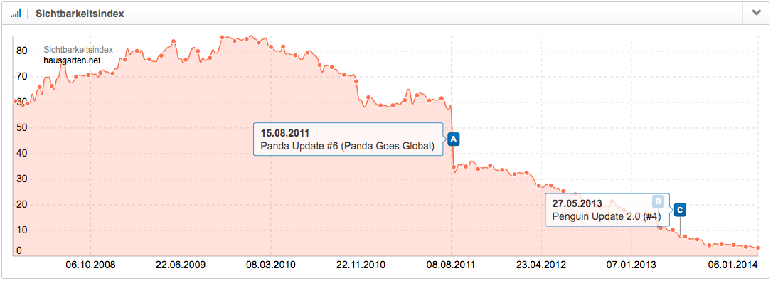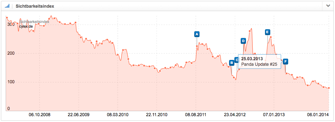 Exemplarisch für Verluste durch weitere Iterationen des Panda-Updates sei hier hotfrog.de (Grafik) genannt. Das Ziel von Google ist es dabei, Treffer mit minderwertigen Content aus den Suchergebnissen herauszufiltern. Anhand der Ereignis-Pins in der Toolbox sieht man eindeutig wie stark die Domain auf die verschiedenen Panda-Updates reagiert hat und im Zeitablauf die Sichtbarkeit der Domain schrittweise dahinschmilzt.