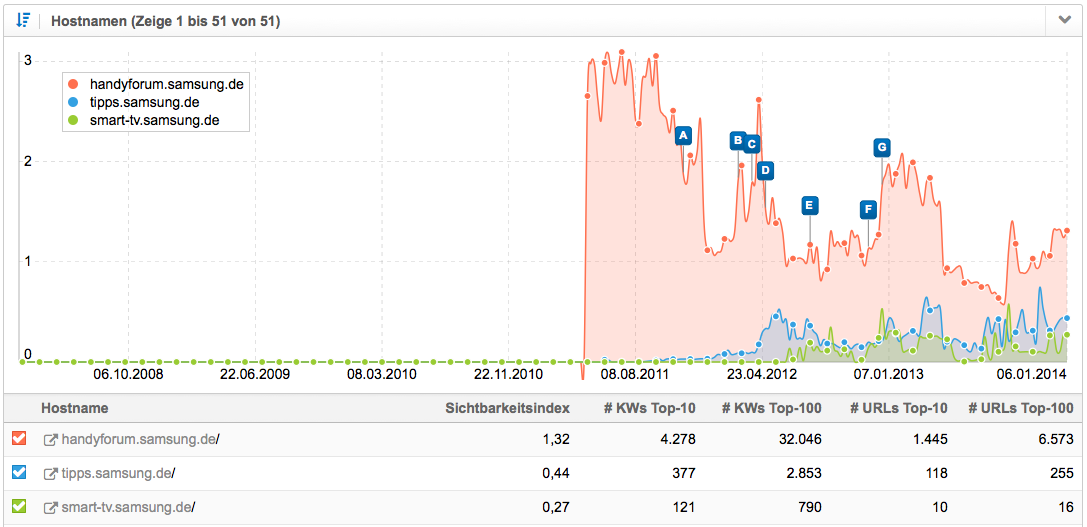 Den umgekehrten (aber ebenso gewollten) Fall, die verschiedenen Länderinhalte auf einer Domain zu konzentrieren, finden wir beispielsweise bei samsung.de (Grafik) auf Platz 52. Die Hauptdomain leitet auf samsung.com weiter, allerdings sind Subdomains der DE-Domain noch aktiv (Grafik).