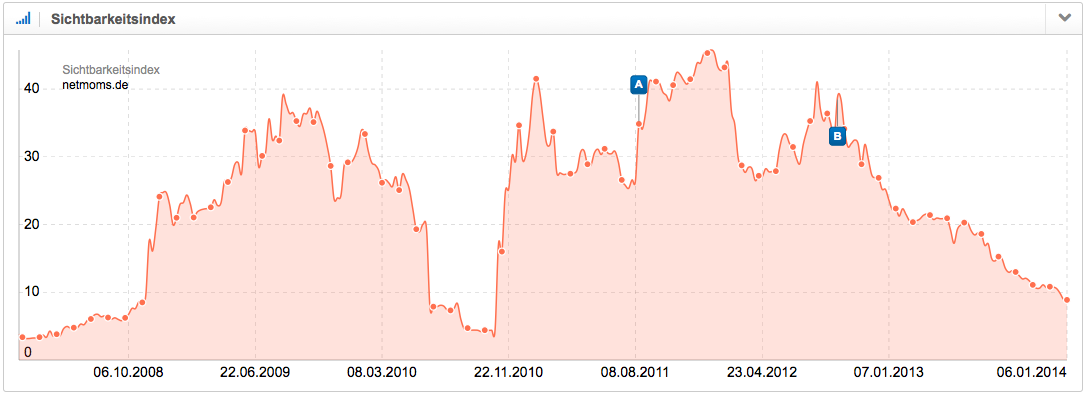 Bei nicht wenigen Domains kann man eine stetig fallende Sichtbarkeit beobachten. Zum Teil in Kombination mit einem stärkeren Einbruch bei einem Google Update, zum Teil aber auch fließend. Als Beispiel kann man hier das bekannte Startup netmoms.de (Grafik) auf Platz 30 nennen, das 2013 64 Prozent Sichtbarkeit eingebüßt hat. Eine Analyse der Verzeichnisebene der Domain (Grafik) zeigt, dass das Verzeichnis /fragen/ am stärksten verloren hat und auf Verzeichnisebene dann auch ein Zusammenhang zum Panda-Update vermutet werden kann. In dem Verzeichnis befindet sich ein typische Frage-Antwort-Portal, mit sich überschneidenden Themen und Keywords. Man kann unterstellen, dass solche Treffer bei vielen Suchanfragen nicht die beste Antwort sind und Google dieses anhand der Nutzersignale inzwischen immer besser erkennen kann. Ähnliches trifft auf viele Foren zu.