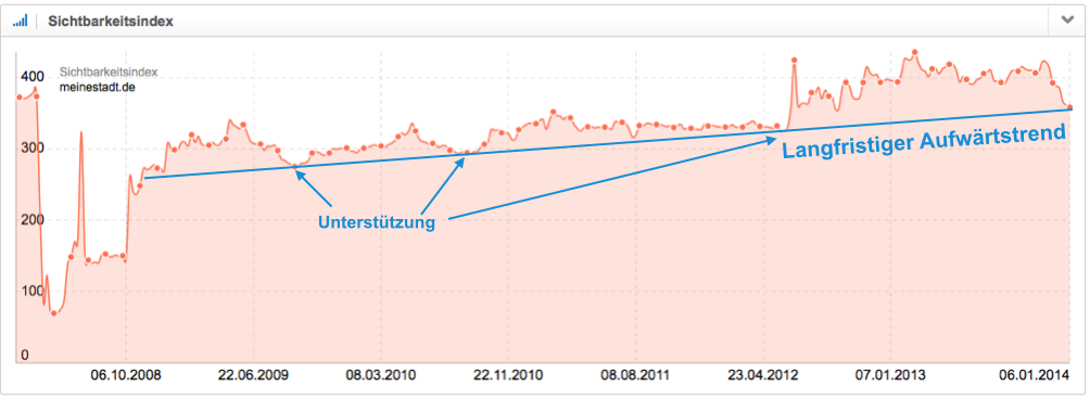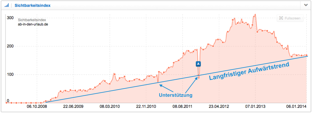 Werfen wir noch einen kurzen Blick auf die Liste der Verlierer nach absoluten Punkten, finden wir ein paar große Domains, die prozentual nicht ganz so stark verloren haben, in absoluten Punkten aber eine beunruhigende Entwicklung vorweisen. Spannend sind für mich dabei insbesondere die Domains, deren Sichtbarkeit sich zum Jahresende an die Grenze der langfristigen Trendlinie entwickelt hat wie z.B. ab-in-den-urlaub.de (Grafik) auf Platz 2, helpster.de (Grafik) auf Platz 7 und meinestadt.de (Grafik) auf Platz 12. Hier wird es in den nächsten Wochen und Monaten spannend zu beobachten sein, ob die langfristige Trendlinie wie in den vergangenen Jahren als Unterstützung hält, so das die Sichtbarkeitsentwicklung daran abprallt und wieder steigt. Werden die langfristigen Trends jedoch durch ein Fortschreiten der jüngsten Abwartsbewegungen durchbrochen, drohen 2014 stärkere Verluste.