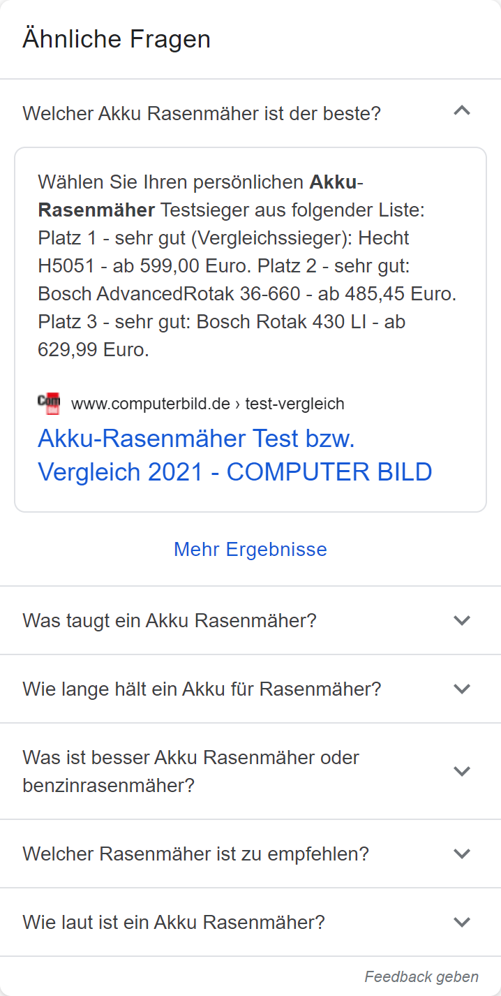 Oft wird dieses Wettbewerbsverhältnis an einzelnen Integrationen in sehr umkämpften Branchen festgemacht. Hier will ich zeigen, dass es jeden Webseitenbetreiber betrifft. Es geht um die “Ähnliche Fragen”-Boxen in den Google-Suchergebnissen: