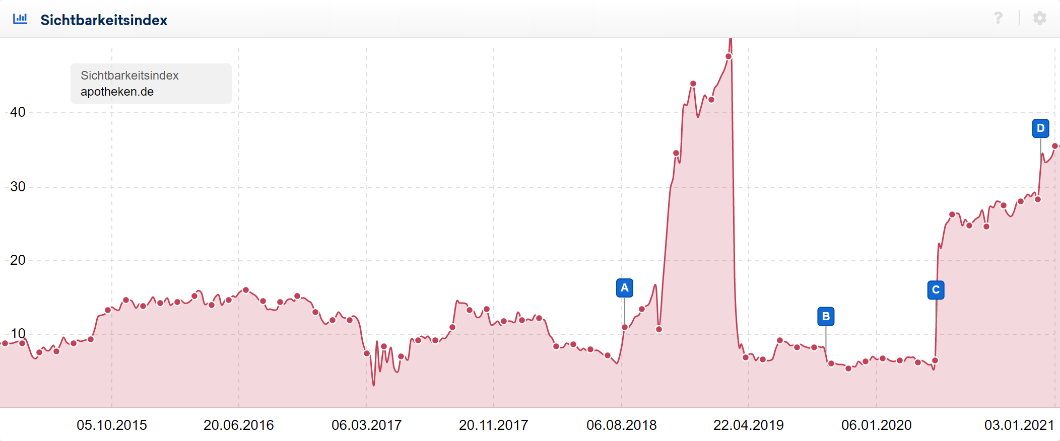 Ähnliche Verläufe zeigen sich für viele Domains, insbesondere solche aus dem YMYL-Bereich. Als Beispiele können folgende Domains dienen: apotheken.de, gesetzlichekrankenkassen.de oder auch finanzfluss.de.