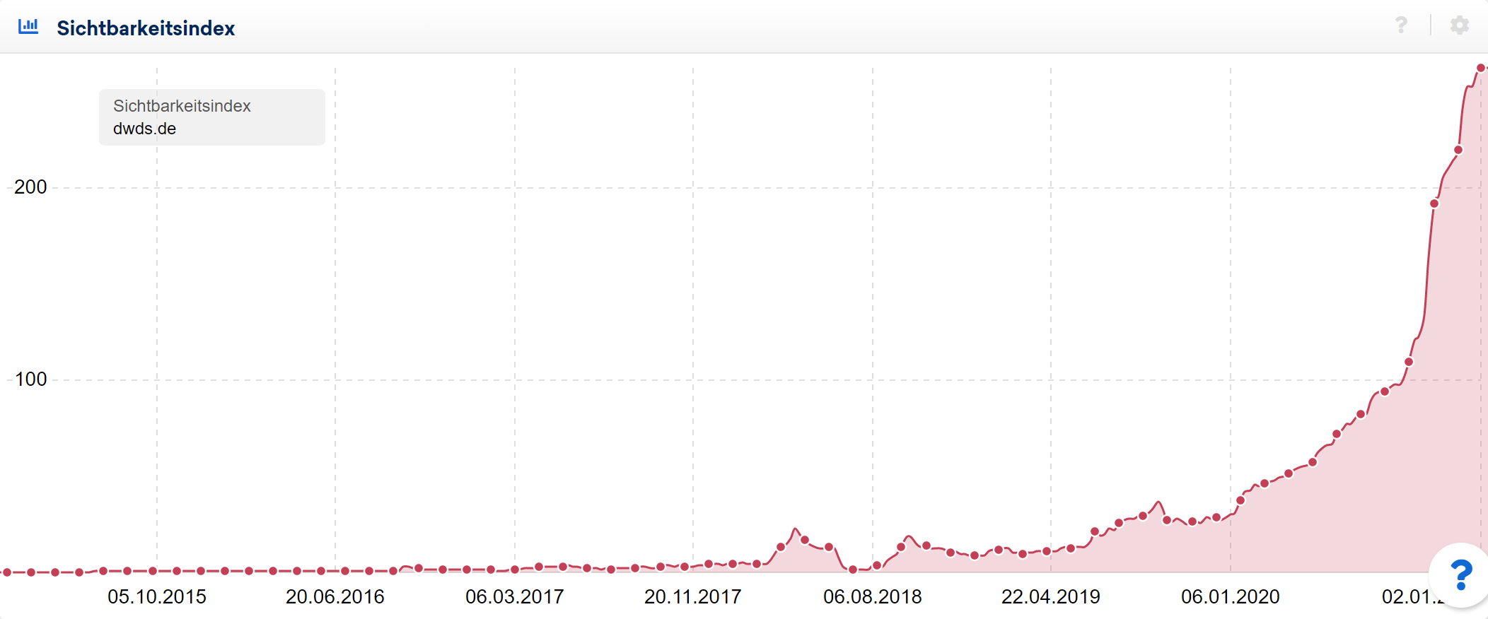 Die Informationen zu einzelnen Worten sind umfassend, vollständig, korrekt und hilfreich. Und damit in den meisten Fällen objektiv besser als die Angebote der Wettbewerber in den Google-SERPs. Das zeigt sich auch deutlich im Vergleich der Sichtbarkeitsverläufe: