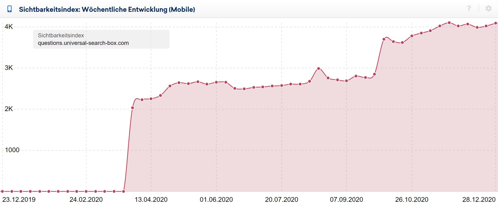 Jetzt, zum Jahreswechsel, hat die Integration bereits einen Sichtbarkeitsindex von über 4.000 Punkten erreicht. Sie ist damit die sichtbarste Integration von Google, die organische Treffer aus den SERPs verdrängt. Alleine in Deutschland messen wir über 11 Millionen Keywords, für die diese Box ausgespielt wird. Herzlichen Glückwunsch zu diesem Erfolg, Google.