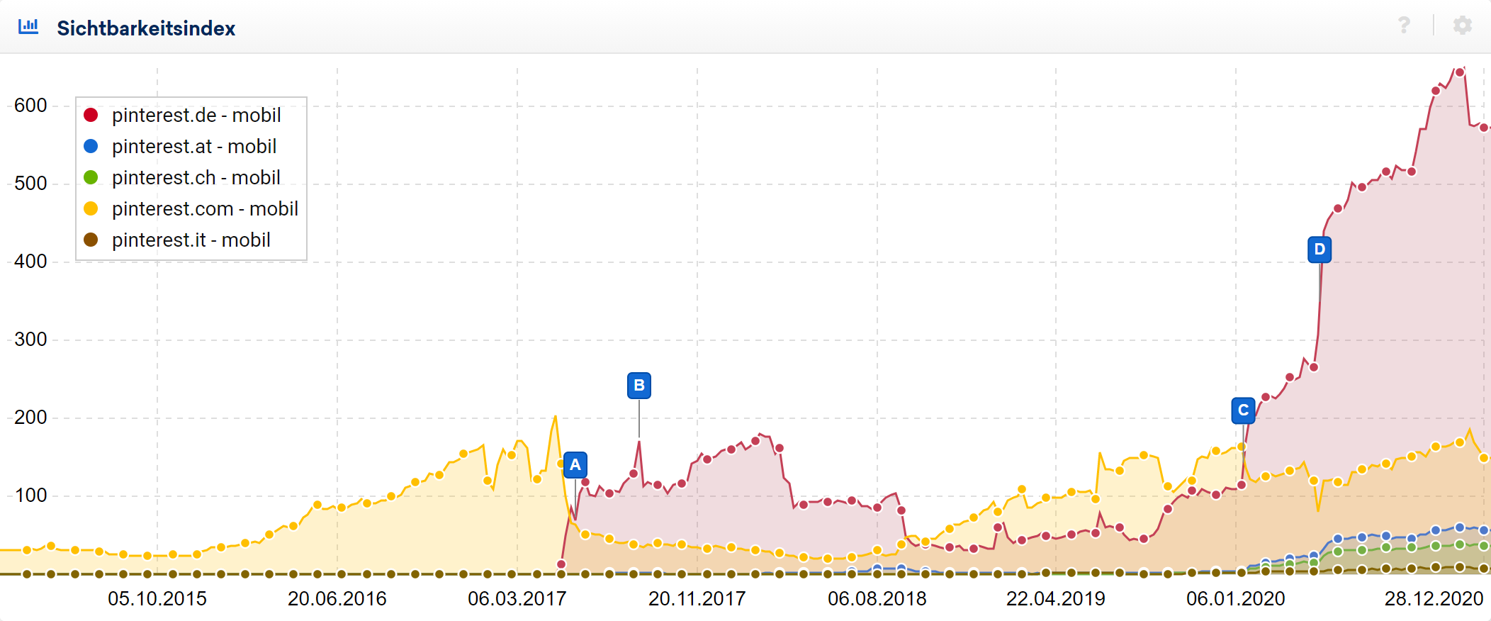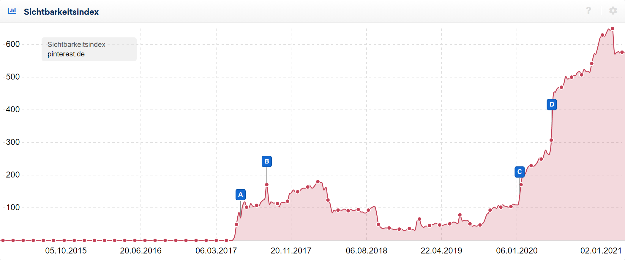 Pinterest ist einer der großen Sichtbarkeitsgewinner des letzten Jahres. Die Mischung aus sozialem Netzwerk, Online-Pinnwand und visueller Suchmaschine konnte massiv an Sichtbarkeit gewinnen: