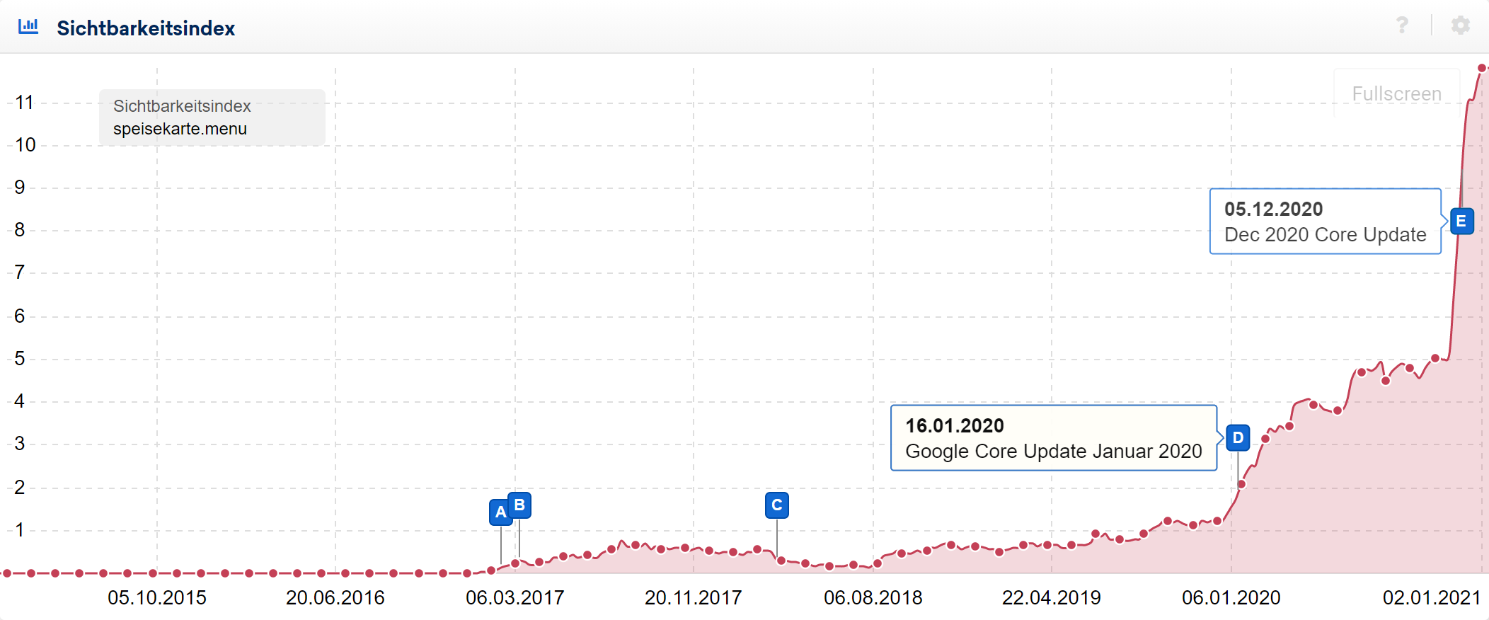 Fast kein SEO-Artikel des letzten Jahres ist ohne die Erwähnung der Nutzerintention ausgekommen: was sucht der Nutzer und erfüllt meine Webseite dieses Bedürfnis? Wie sich die Erfüllung der Nutzerintention konkret in der Sichtbarkeit einer Seite auswirkt, ist gut am Beispiel von speisekarte.menu zu beobachten:
