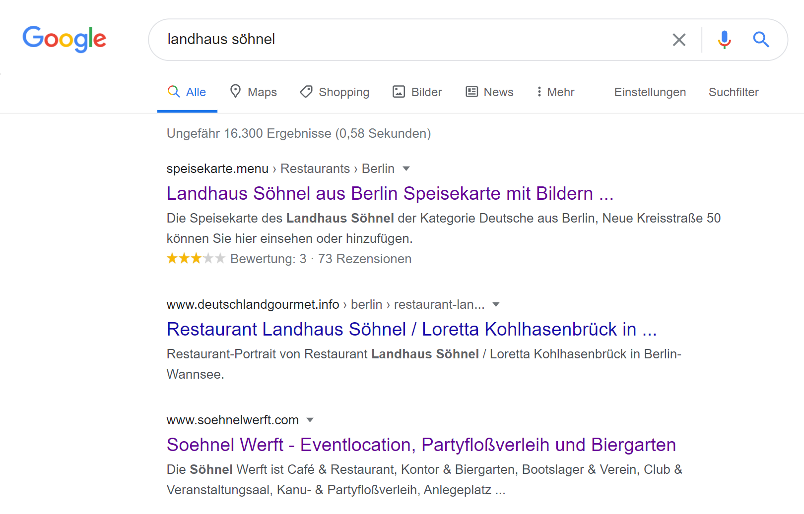 Und trotzdem ist sie bei Google erfolgreich: weil sie die Intention der Suchenden erfüllt. In vielen Fällen rankt die Domain damit sogar vor den offiziellen Seiten der Restaurants: