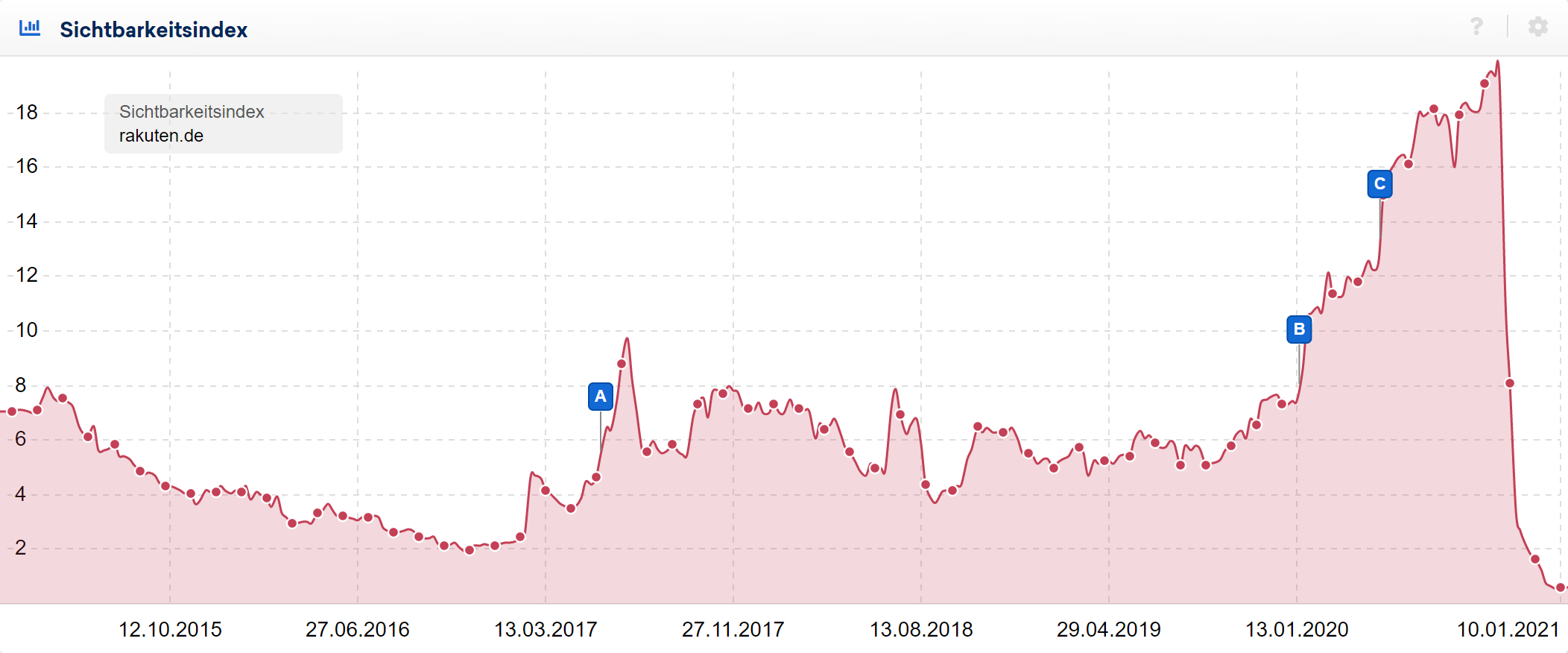 Fast zehn Jahre hat die japanische Firma versucht, in Deutschland einen funktionierenden Marktplatz zu etablieren – und dann im Herbst 2020 die Reißleine gezogen und den Rückzug aus Deutschland angekündigt. Schade um die ganze Sichtbarkeit mit kommerziell interessanten Keywords.