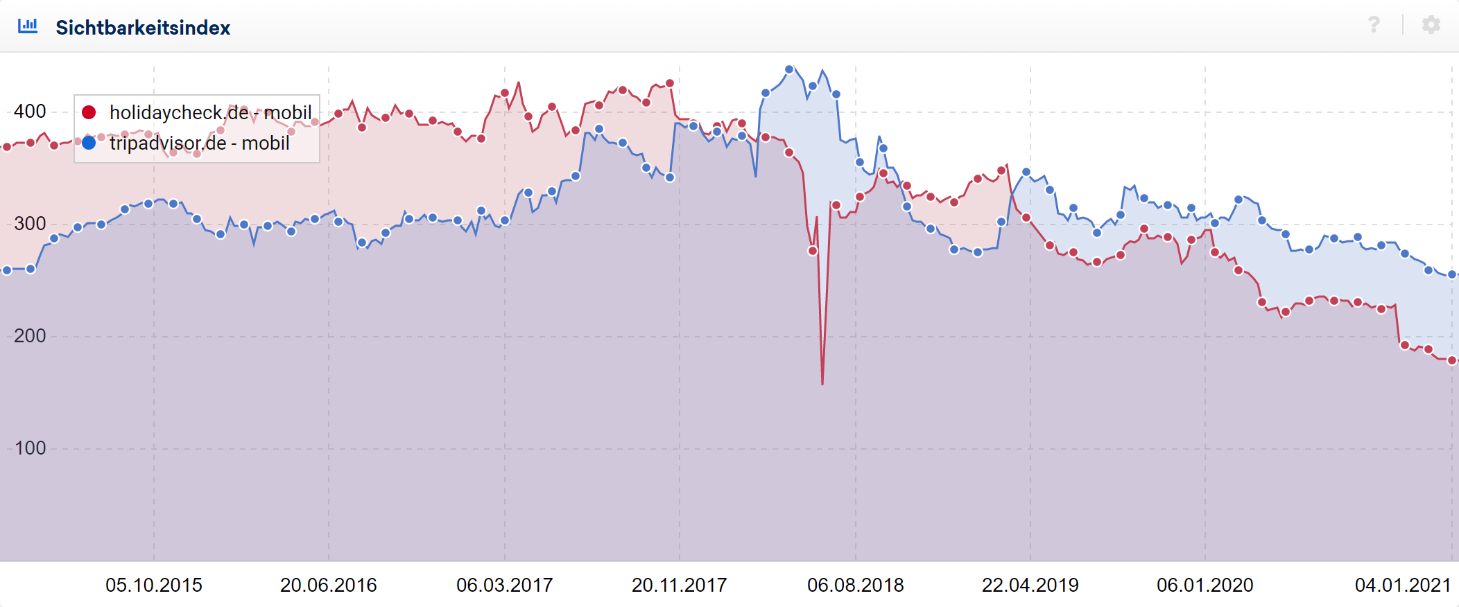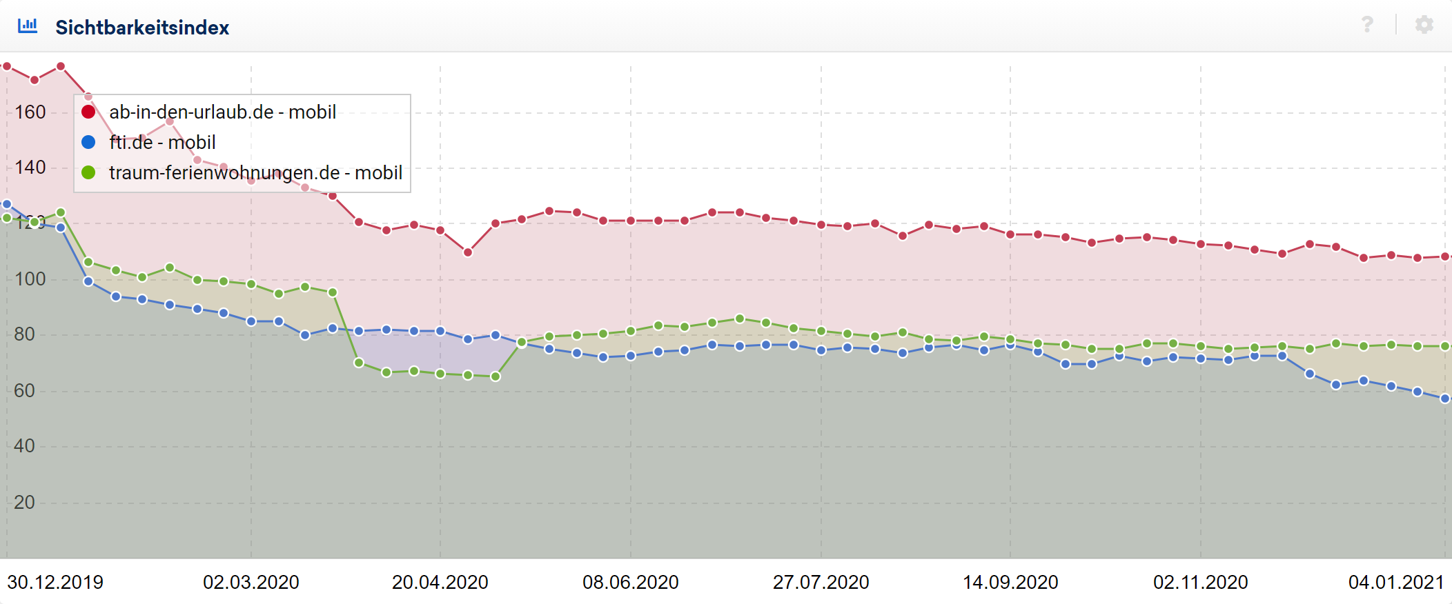 Umso interessanter ist es, dass viele Reiseseiten im vergangenen Jahr an Sichtbarkeit bei Google verloren haben. Hier drei Beispiele aus der Branche: