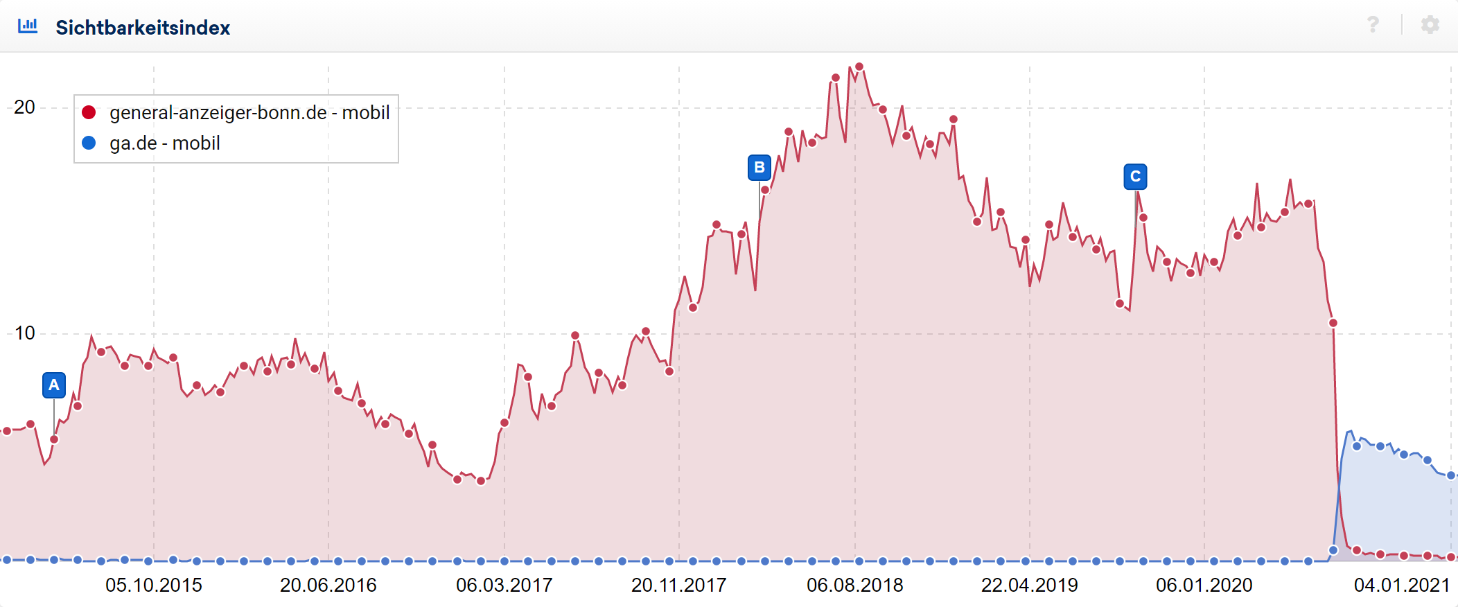 Der Umzug von general-anzeiger-bonn.de auf die prägnante ga.de war in der Theorie sicherlich richtig, in der Praxis hat dieser Umzug (inklusive Wechsel des CMS) aber einiges an Sichtbarkeit gekostet.