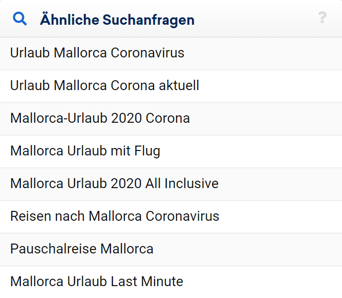 Das zeigt sich auch in den Ähnlichen Suchanfragen sehr deutlich, hier am Beispiel von “mallorca urlaub”. Viele der Vorschläge drehen sich mittlerweile um Corona und Google folgt mit den SERPs diesem Informationsbedürfnis der Nutzer: