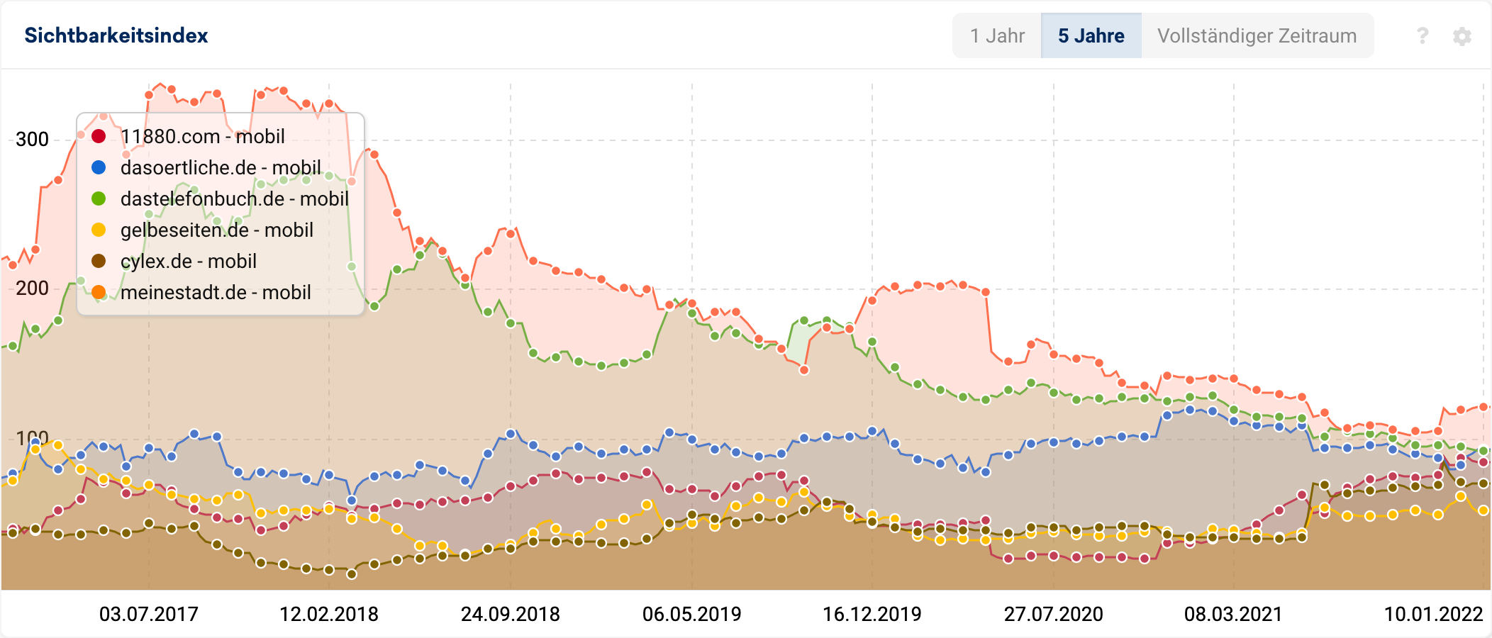 Dennoch konnten in diesem Jahr 11880.com und auch cylex.de enorm vom Core Updates im Juli profitieren, was angesichts des Fünfjahresverlauf jedoch bestenfalls eine Erholung verlorener Sichtbarkeiten war:
