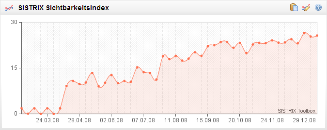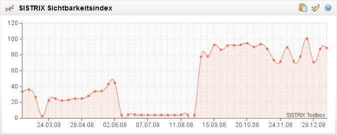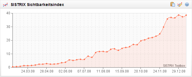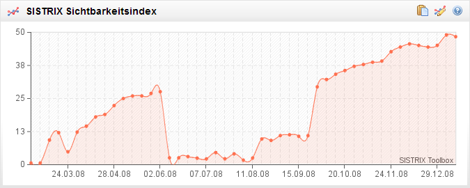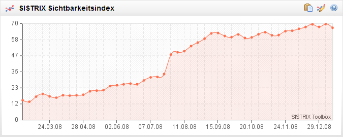 Wie bereits angekündigt, möchte ich auch noch eine IndexWatch-Auswertung über das ganze Jahr 2008 präsentieren. Da die reinen Zahlen nicht so spannend sind, habe ich einige Beispiele raus gegriffen um an ihnen gute und schlechte Vorgehensweisen aufzuzeigen. Los geht es in diesem Posting mit den Gewinnern 2008. Die Zahlen sind die prozentuale Veränderung des SISTRIX Sichtbarkeitsindex-Wertes im Vergleich zu Anfang des Jahres und beziehen sich auf den deutschen Gooogleindex.