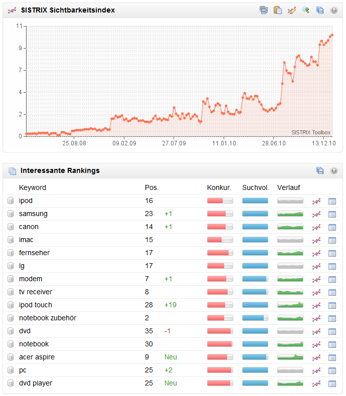 Zum anderen sind es Unternehmen, die im Internet bereits Geld verdienen, SEO im letzten Jahr aber als weiteren, interessanten Marketingkanal entdeckt haben. Schaut man sich zum Beispiel den Sichtbarkeitsindex-Verlauf von cyberport.de an, fällt auf, dass sich die Präsenz in den Google-SERPS innerhalb des letzten Jahres rund verdreifacht hat. Hier könnte ich mir gut vorstellen, dass steigende Preise für SEM-Werbung oder Traffic aus Preisvergleichen dazu beigetragen hat, dass sich man nach Alternativen umgesehen hat.