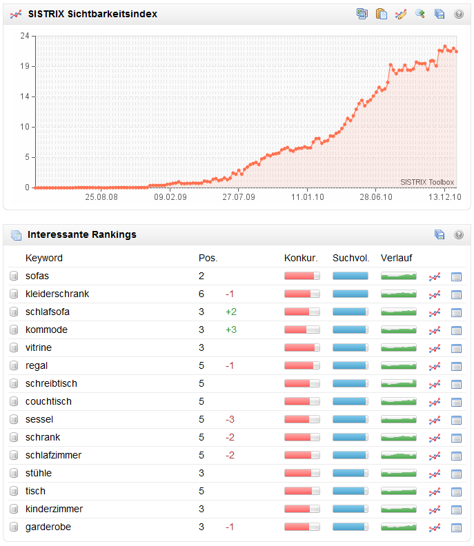 Schaut man sich die Liste weiter an, so finden sich zwei interessante Gruppen von Domains: zum einen sind da viele Offline-Marken, die lange den Homer Simpson gegeben haben („Internet? Gibt es diesen Unsinn immer noch?“), im letzten Jahr dann aber in die Optimierung ihrer Seiten investiert haben. Gut zu sehen ist das beispielsweise bei schoener-wohnen.de: war die Domain Anfang 2009 noch fast gar nicht bei Google zu finden, wurden 2009 die Fundamente gelegt, um 2010 richtig nach oben zu schießen. Mittlerweile ist die Domain bei zahlreichen, auch kommerziell interessanten, Keywords unter den Top-10 gelistet und wenn man Kosten und Nutzen von SEO hier gegenüberstellt, so bin ich mir sicher, dass kaum eine andere Werbeform ähnliche Ergebnisse gebracht hätte.
