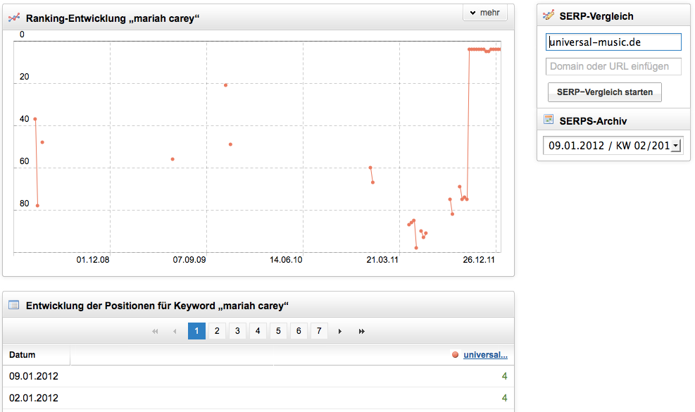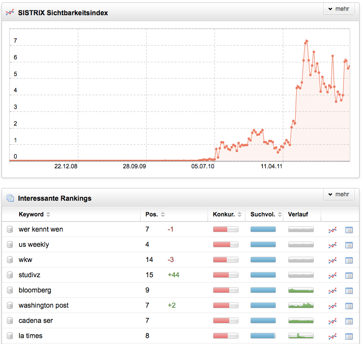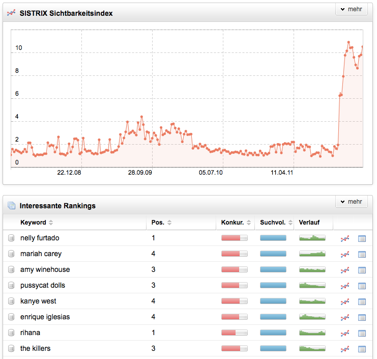 Aber auch alteingesessene Marken sind unter den Gewinnern 2011 zu finden. Hier kann man Beispiele wie universal-music.de, berliner-zeitung.de und christ.de nennen. Solange es weiterhin solche schlafenden Riesen gibt, die wachgeküsst werden können, braucht sich die SEO-Branche wahrlich keine Gedanken über Beschäftigungsmangel zu machen. Während universal-music.de Anfang 2011 noch bei Suchanfragen zu seinen populären Künstlern wie Amy Winehouse, Mariah Carey oder Jennifer Lopez nicht in den Top 100 zu finden war, ist die Domain nach einer Investition in SEO-Maßnahmen bei diesen und vielen anderen Keywords nun ein Dauergast unter den ersten 10 Treffern. Die Universal Music Group wird diese Investition sicherlich nicht bereuen.