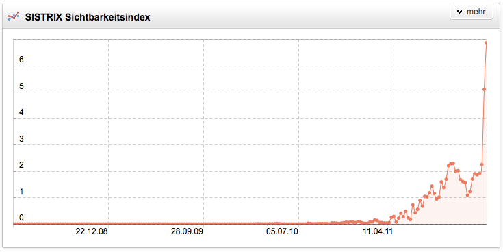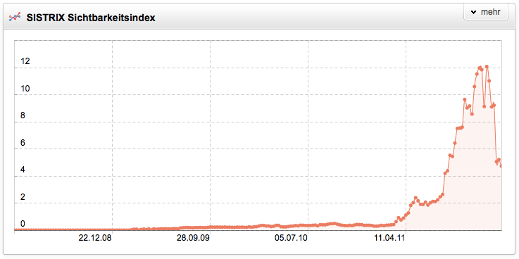 Traditionell veröffentlichen wir im Januar immer eine Aufstellung der SEO-Aufsteiger und -Absteiger des vergangenen Jahres. Auch diesmal beginnen wir mit den Gewinnern. Die Liste wurde auf Grundlage des SISTRIX Sichtbarkeitsindex erstellt und zeigt die Domains mir dem größten prozentualen Zuwächsen in 2011. Wir haben dabei nur die Gewinner-Domains berücksichtigt, deren Sichtbarkeitsindex zum Jahresende mindestens 5 Punkte betragen hat, um Daten von einigermaßen prominente und etablierte Kandidaten zu liefern. Domains, bei denen ein Domainumzug die Ursache war oder die Ende 2010 kurzzeitig eine Penalty hatten und deswegen in diese Liste gerutscht wären, wurden nicht aufgenommen. Diese Einträge wären ungeeignet anzuzeigen, was im letzten Jahr gut bei Google ankam.