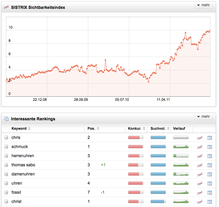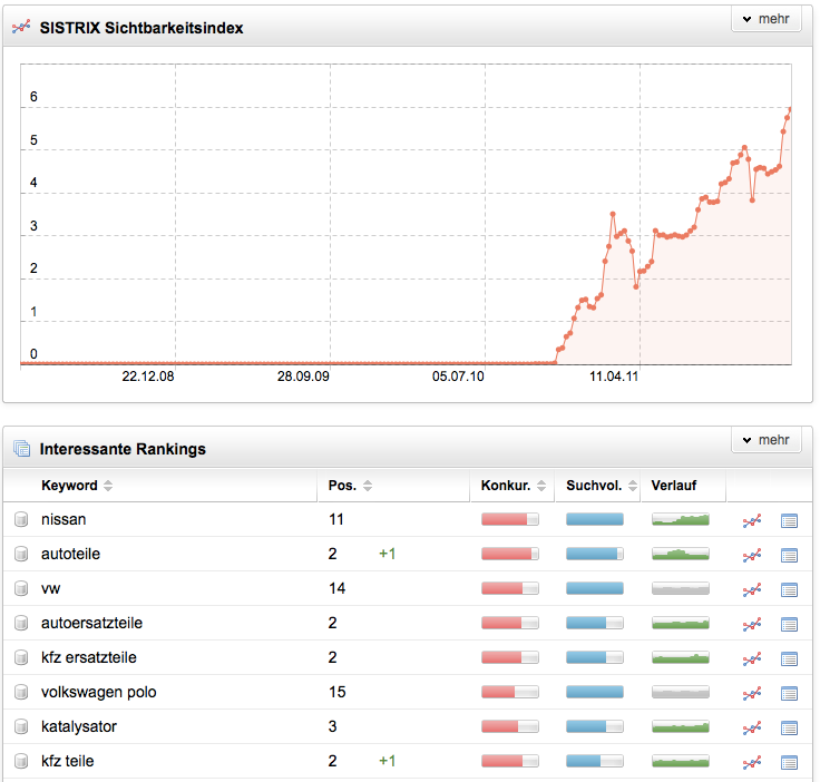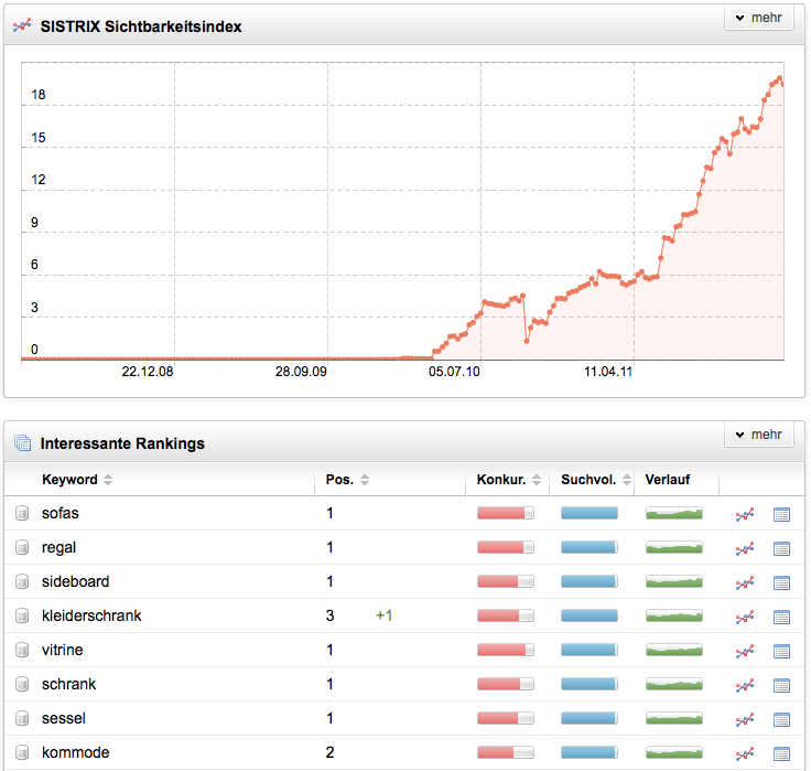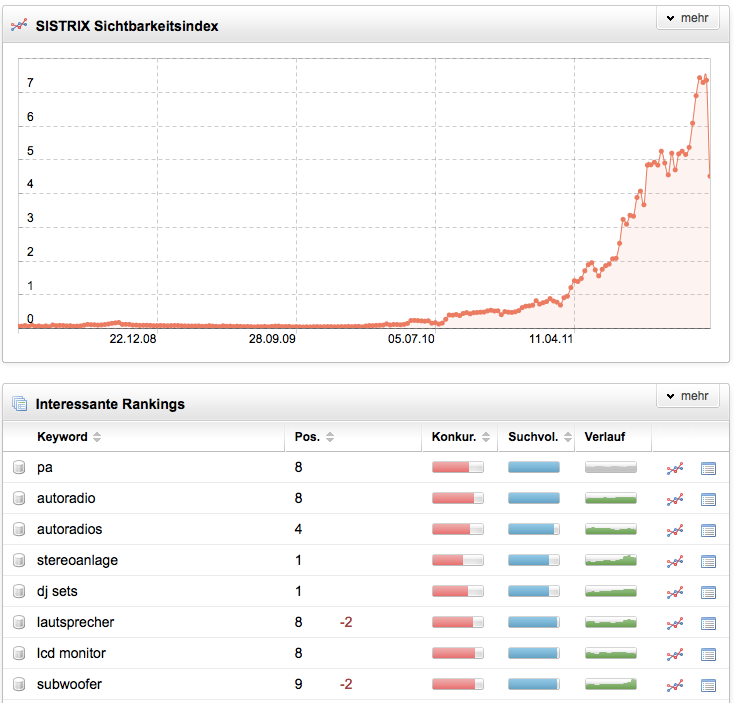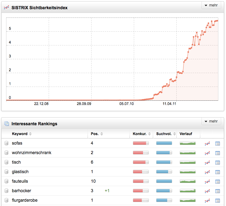 Auch im Shop-Bereich ist zu beobachten, dass mit den entsprechenden SEO-Maßnahmen auch ohne eine lange History der Domain weiterhin sehr attraktive Rankings zu umkämpften Keywords realisiert werden können. Beispiele sind elektronik-star.de, moebel-sensation.de, moebel-profi.de, autoteiledirekt.de und einige weitere Domains. Auch in diesem Bereich wird wieder deutlich, dass es sich bei SEO immer um einen ständigen Prozess und niemals ein abgeschlossenes Projekt handelt. Der SEO-Wettbewerber schlafen nicht und es gibt immer neue Herausforderungen und Aufgaben.