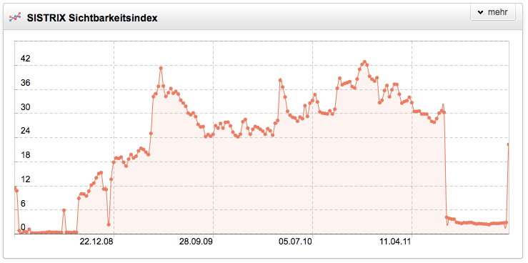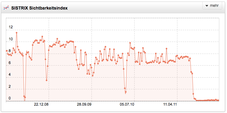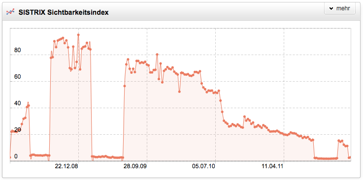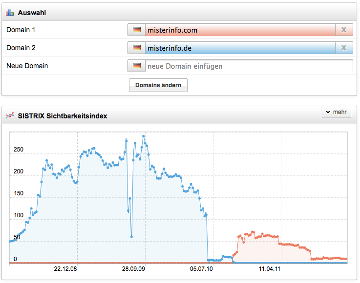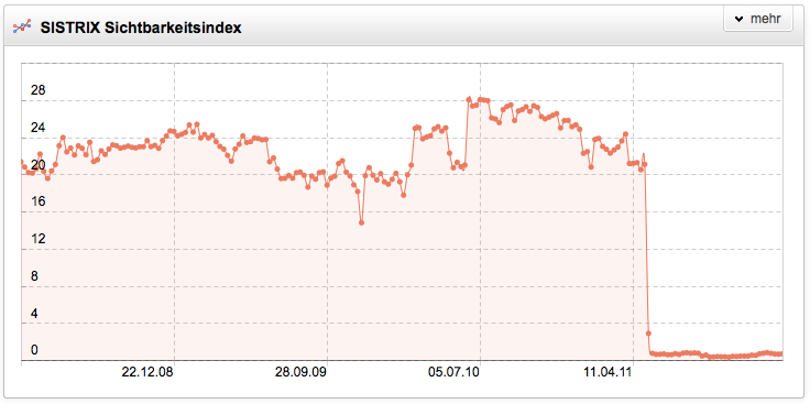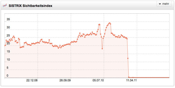 Noch erfolgreicher als das Panda-Update haben einige Websitebetreiber selbst ihre Sichtbarkeit bei Google vernichtet. So war handys-mobile.de beispielsweise eine Website mit einem Sichtbarkeitsindex von über 20 Punkten und vielen guten Rankings zu sehr attraktiven Keywords. 2011 ist die Domain ganz aus dem Web verschwunden und die Tatsache, dass die Domain jetzt auf eine Rechtsanwaltskanzlei in Hamburg registriert ist, läßt ein unglückliches Schicksal vermuten. Was immer dort passiert ist, die komplette Stilllegung der Domain war wirtschaftlich sicherlich nicht die beste Lösung.