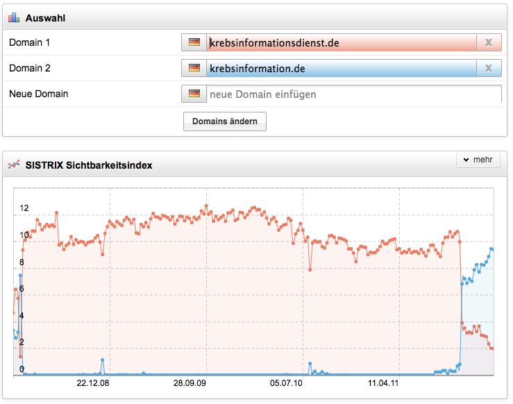 Ein beliebter Fehler ist auch immer wieder der parallele Betrieb von mehreren Domains für ein und dieselbe Website. So scheinen sich die Betreiber von apotheke-online-internet.de sich nicht entscheiden zu können, ob sie ihre Website auf dieser Domain oder doch lieber pharma24.de laufen lassen. In Summe verlieren beide Domains. Die gleich Unentschlossenheit ist beim Deutschen Krebsforschungszentrum zu beobachten, die sich nicht zwischen krebsinformationsdienst.de und krebsinformation.de entscheiden können. Wertvolle Informationen zu einem wichtigen Thema bekommen so nicht die Sichtbarkeit bei Google, die sie eigntlich verdient hätten. Es wäre sinnvoller die Backlinks beider Domains zu bündeln und keinen Duplicate Content zu erzeugen.