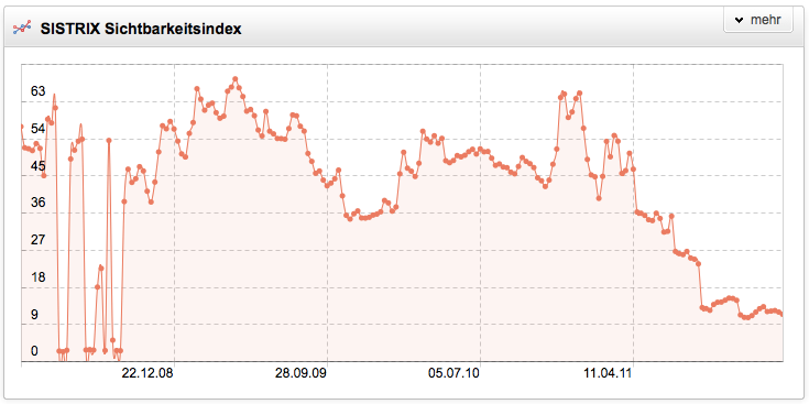 Nachdem wir gestern die Gewinner 2011 veröffentlicht haben, sind heute die Websites an der Reihe, welche prozentual im vergangenen Jahr die meiste Sichtbarkeit bei Google verloren haben. Auch diese Auswertung basiert auf dem SISTRIX Sichtbarkeitsindex. Bei den Verlierern wurden nur Domains berücksichtigt, deren Sichtbarkeitsindex zum Jahresanfang mindestens 5 Punkte betragen hat. Darüber hinaus wurden Fälle mit Domainumzügen herausgefiltert.