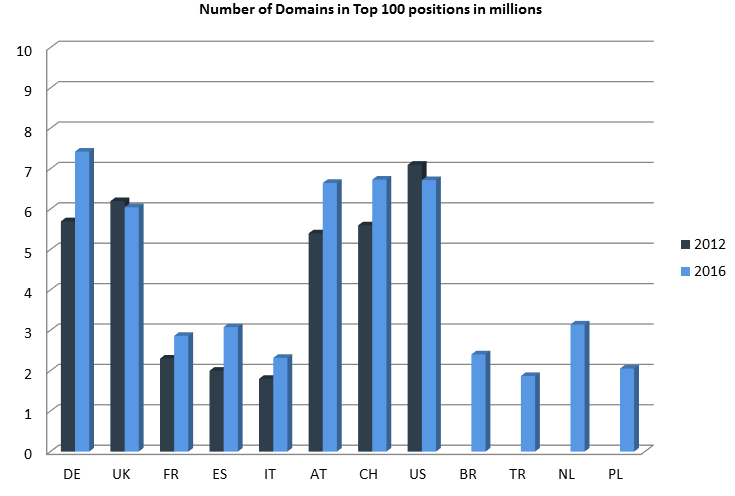 Dieses Chart zeigt, wie viele Millionen verschiedene Domains es schaffen, wenigstens einen Platz einzunehmen innerhalb der besten 100 Ergebnisse zu dem (jeweils pro Land gleich großen und vergleichbar gestalteten) Keyword Set. Je höher der Balken, je mehr verschiedene Domains kämpfen um Platzierungen.Spannend zu sehen, dass praktisch in jedem Land der Wettbewerb in den Top 100 zugenommen hat. Es kämpfen jetzt eine größere Anzahl Domains um Platzierungen in den Rankings. Wie zuvor sind die deutsch- und englischsprachigen Märkte extrem kompetitiv im Vergleich zu den anderen erfassten Märkten. Schön, dass sich auch bei den neu erfassten Ländern das Bauchgefühl des international tätigen SEOs bestätigt.
