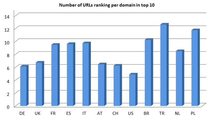 Man sieht also, wie viele verschiedene URLs eine Domain schafft im Schnitt in die Top 10 zu bringen und wir wissen ja alle, dass das der einzige Ort ist, wo man Traffic bekommt. Eine spannende mögliche Implikation hieraus und Diskussion, die man anfangen könnte ist, welchen Einfluss dies auf Contentstrategien hat. Es könnte, wenn man die Daten so interpretieren möchte, vernünftig sein, in weniger kompetitiven Märkten gröbere Contentstrategien durchzuführen und in sehr wettbewerbsintensiven Märkten eher granularer vorzugehen. Letztendlich geht es um den ROI im SEO Bereich. Wenn es mir in manchen Märkten ausreicht mit weniger Content zu arbeiten, weil es mir genügt mich dort thematisch „breiter“ zu engagieren, dann ist das sicher eine spannende Sache. Na schaut mal selbst – vielleicht seht ihr das ähnlich 😉