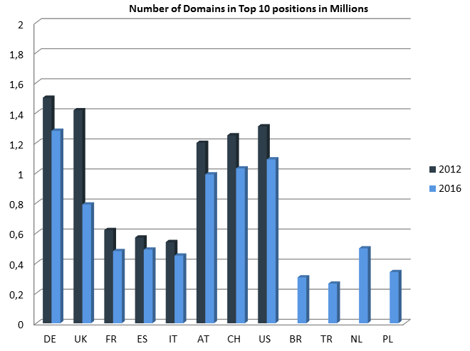 Zu guter Letzt das wichtigste Chart: wie viele (Millionen) Domains erhaschen erfolgreich Top 10 Positionen in dem jeweiligen Land & Jahr. Hier finde ich die Zahlen sehr beeindruckend. Es gelingt in jedem Land VIEL weniger verschiedenen Domains in die Top 10 zu kommen und Traffic zu erhalten! Zeigt wieder einmal mehr: SEO am besten ganz oder gar nicht machen. Zumindest in deutsch- und englischsprachigen Märkten. Und es bleibt die Binsenweisheit des international im SEO-tätigen: Das europäische Umland bietet tolle Chancen-Nutzen-Relationen 😉 Viel Spaß beim Rocken der SERPs – in welchem Land und welcher Sprache auch immer.