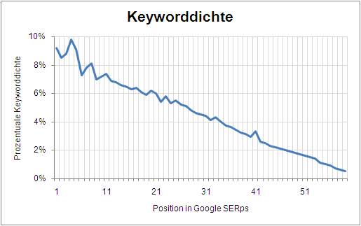 Welche Schlüsse ergeben sich nun aus diesem Test? Zum einen ist die Keyworddichte klar ein Rankingfaktor. Mehr ist hier gleich besser, ein Limit nach oben scheint es in (sinnvollen) Grenzen erstmal nicht zu geben. Allerdings besteht mit zunehmender Keyworddichte eine deutlich erhöhte die Gefahr, dass die Seite deswegen in einen Filter gerät und nach hinten durchgereicht wird – ein Wert zwischen 1,0% und 4,0% liegen nach diesem Test innerhalb der sicheren Parameter und ich würde mich ehrlich gesagt auch wundern, wenn man diesen Wert in einem gut lesbaren Fließtext sinnvoll überschreiten könnte.