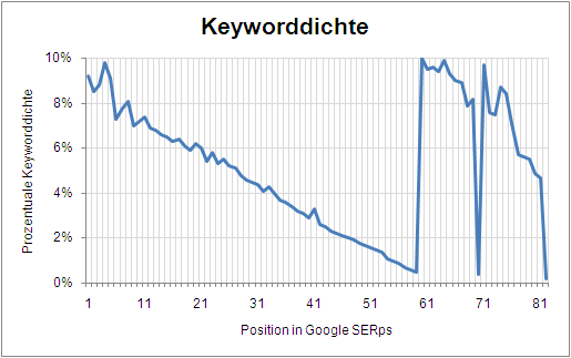 Die Grundüberlegung für folgenden Test war, dass Google Seiten, die einen höheren Wert haben, besser rankt, als solche mit einer niedrigen Keyworddichte (unter der Bedingung, dass alle anderen Faktoren gleich sind). Darauf aufbauend habe ich diesen Test aufgesetzt: eine Menge sinnloser Fließtexte, die sich einzig in der Keyworddichte unterscheiden – hier sind alle Werte zwischen 0,1 und 10% vorhanden. Alle anderen möglichen Faktoren habe ich versucht gleich zu halten. Von Interesse ist nun: welche Seiten stehen bei der Suche nach dem Keyword vorne? Überraschenderweise sind es wirklich die Texte mit einer möglichst hohen Keyworddichte: auf der ersten Seite findet sich alles zwischen 7,0 und 9,8%. Schaut man sich das Ganze mal für die ersten 60 Positionen an, so sieht das so aus: