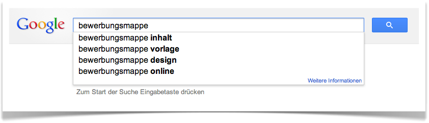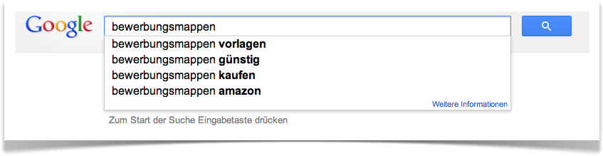 Gibt man „Bewerbungsmappe“ (Singular) bei Google ein, erhält man aktuell folgende Vorschläge.