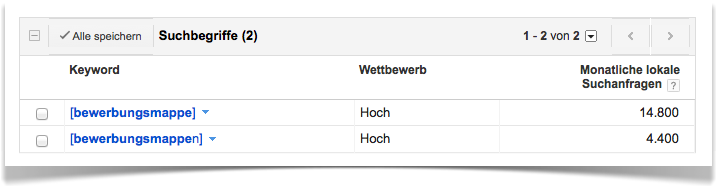 Wenn beispielsweise ein Anbieter von Bürobedarf eine Keyword Recherche durchführt, steht er vor der Wahl, ob er seine Produkt-Kategorienseite mit Bewerbungsmappen auf das Keyword „Bewerbungsmappe“ (Singular) oder „Bewerbungsmappen“ (Plural) optimieren soll. Eine Keyword Recherche nach dem Suchvolumen im Google Keyword Tool liefert das folgende Ergebnis.