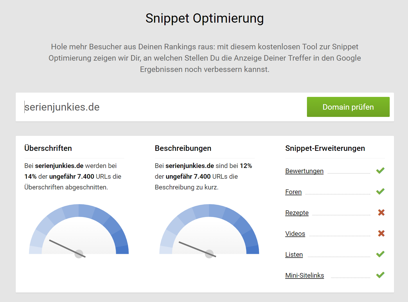 Um die letzten paar Tage dieses und die ersten Tage des nächsten Jahres sinnvoll zu nutzen, haben wir ein kleines kostenloses Tool gebaut, mit dem ihr einen ersten Eindruck über die Snippet-Optimierung einer Webseite erhaltet. Einfach die Domain in die Suche eingeben und los geht’s: