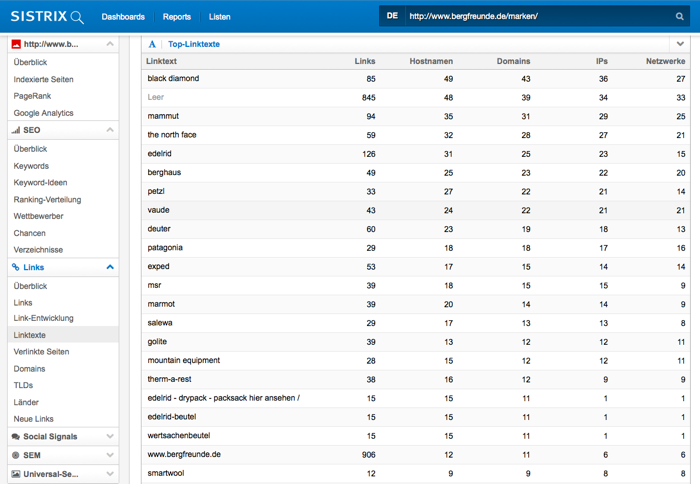 Für www.bergfreunde.de/marken/ liefert die Toolbox folgende Daten als häufigste Linktexte.