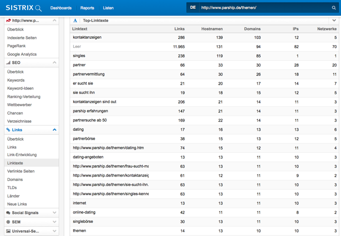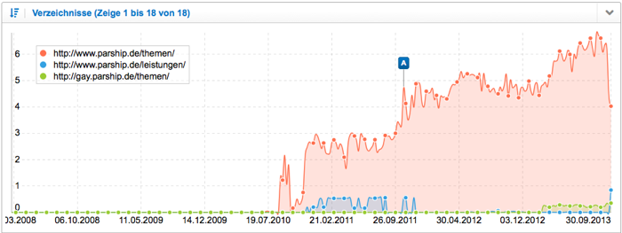 Ein ähnliches Bild zeigt die Analyse der Verzeichnisse von parship.de. Hier ist das Verzeichnis www.parship.de/themen/ stark betroffen, während die Verzeichnisse www.parship.de