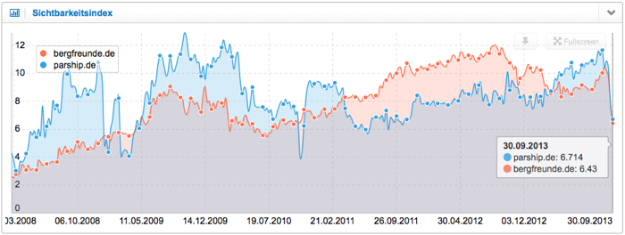 Man sieht bei beiden Domains einen ungewöhnlich starken Einbruch im Sichtbarkeitsindex in den beiden Wochen nach dem 16.09.2013. Wenn mehrere Domains zum gleichen Zeitpunkt eine ähnliche Entwicklung zeigen, stellen sich natürlich Fragen nach eventuell gemeinsamen Ursachen und Google Updates.