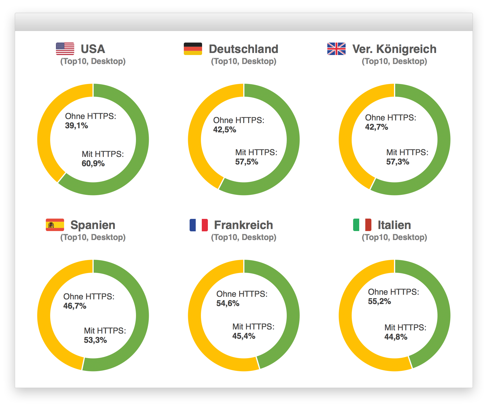 So sehr Google auch drückt und beschwört, letztlich hängt die Umstellung auf HTTPS an den Webseitenbetreibern und ist, je nach Techniksetup, unterschiedlich komplex. Um zu erfahren, wie weit die Umstellung in unterschiedlichen Ländern bereits ist, haben wir aktuelle Zahlen für die Top-10 in den USA, Deutschland, dem vereinigten Königreich, Spanien, Frankreich und Italien erhoben: