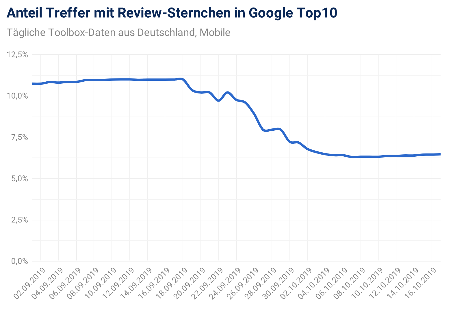Gemessen haben wir den prozentualen Anteil von Suchtreffern in den Top10 von unserem täglichen Keyword-Sets mit Review-Sternchen. Nachdem es lange keine signifikante Änderung gab, ist ab dem 19.09.2019 gut zu sehen, wie der Anteil von vorher rund 11% stetig abnimmt und sich etwa ab dem 05.10. auf dem neuen niedrigen Niveau von rund 6,3% einpendelt. Adios, ihr hilfreichen Review-Sternchen!