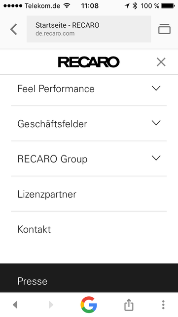 Die Navigation bei Recaro ist die reine Innensicht des Unternehmens. Es wird die interne Organisation In Form von USPs (Alleinstellungsmerkmal von engl. unique selling proposition), strategischen Geschäftsfeldern und Partnerunternehmen aufgezählt.