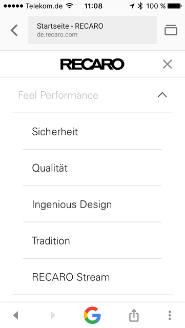 Es gibt viele schicke Websites von Unternehmen und Organisationen, die aber leider völlig am Ziel vorbeischießen. Oft sind sie nicht mehr als eine digitalisierte Hochglanz-Unternehmensbroschüre. Das klingt in manchen Ohren vielleicht gar nicht schlecht. Aber Unternehmensbroschüren sind meist die langweiligste Sache der Welt. Werbung pur, die ohne Bezahlung nicht gerne im Netz geteilt wird. Als Beispiel möchte ich hier einmal die Website von Recaro und speziell deren Hauptnavigation nennen. Das Unternehmen ist insbesondere durch seine Auto- und Kindersitze bekannt.